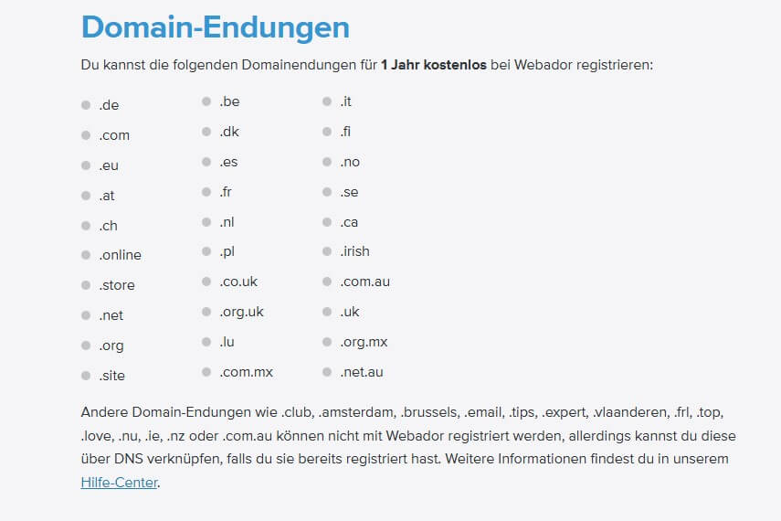 Bei der Registrierung einer Domain über Webador stehen zahlreiche Top-Level-Domains (TLDs) zur Auswahl. Darunter finden sich klassische Endungen wie .de, .com oder .org, aber auch modernere Varianten wie .online oder .shop. Damit sind sowohl lokale als auch internationale Zielgruppen gut abdeckbar. Zwar bietet Webador nicht die komplette Bandbreite aller weltweit verfügbaren TLDs, doch für kleine und mittelgroße Projekte sind die wichtigsten Endungen problemlos registrierbar. Domains mit regionalem oder themenspezifischem Bezug (z. B. .berlin, .design) sollten ggf. extern bezogen und dann verknüpft werden.