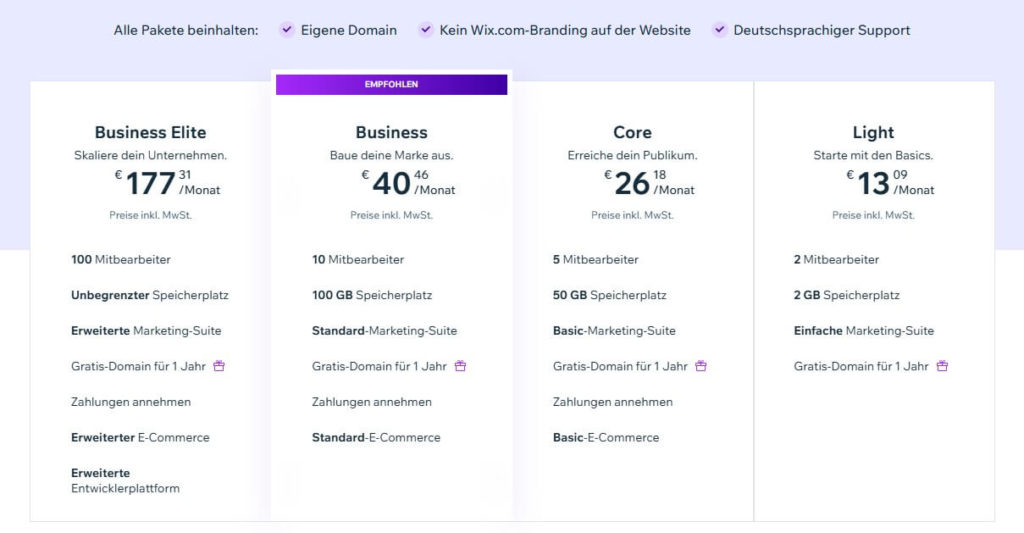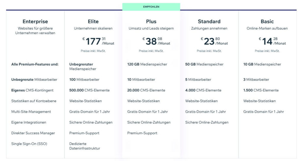 Hinweis: Die Preise können je nach Region variieren. Für genaue Informationen besuchen Sie bitte die offizielle Wix-Website.
