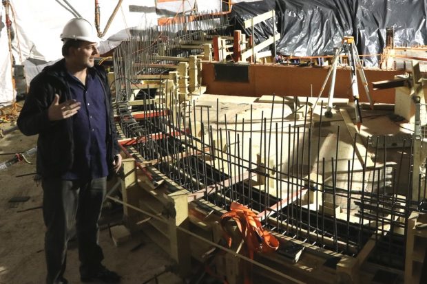 Für 2017 angekündigt, konnte man am 12. Januar 2018 gemeinsam mit ihm zumindest den Unterbau des runden Konstruktes bestaunen. Wenn man sich denn die Stufen am Baugerüst im gleißenden Scheinwerferlicht empor traute – mancher begnügte sich dann doch lieber mit Fotos der Zurückkehrenden.