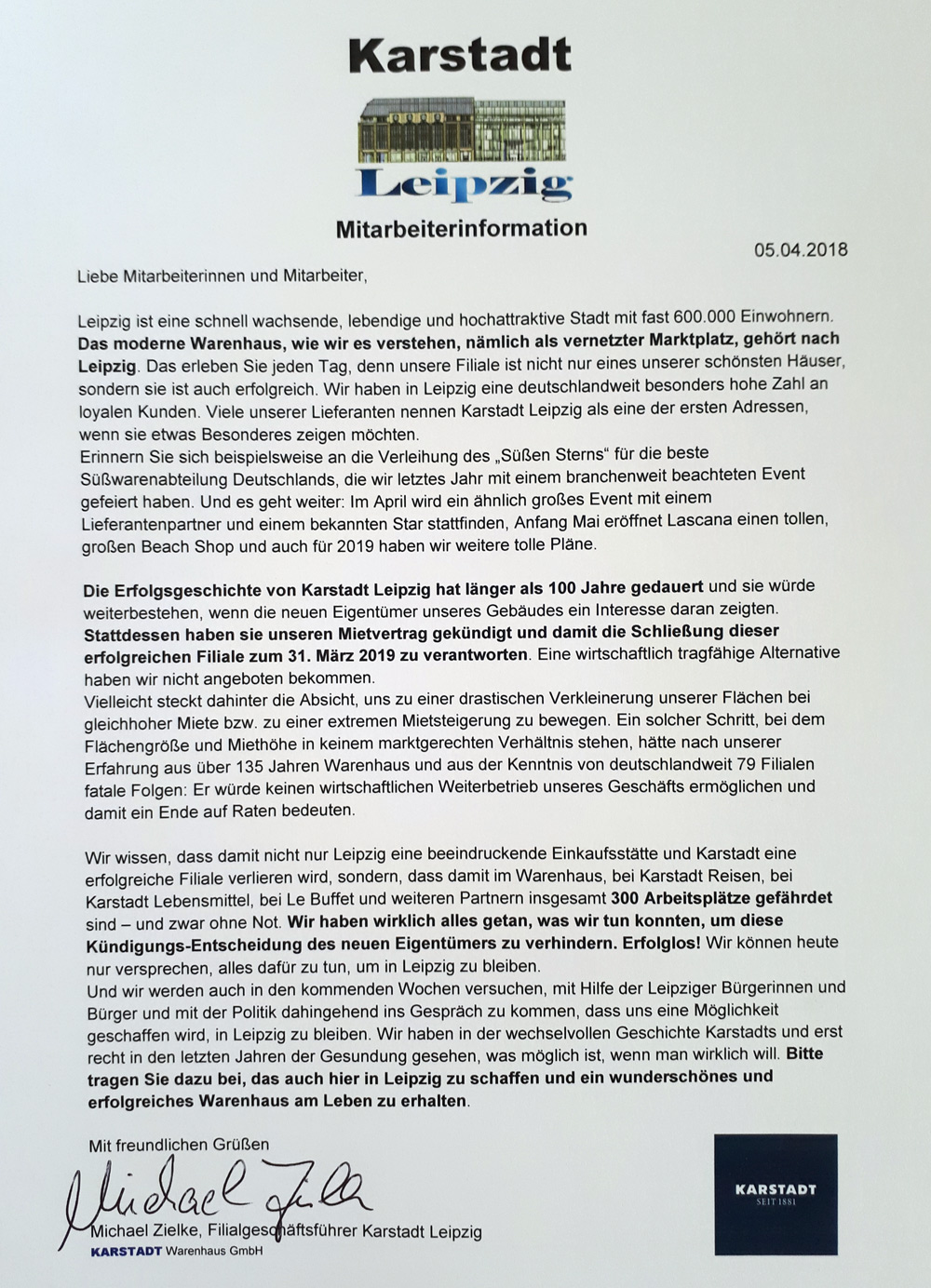 Am Donnerstag, 5. April, informierte Michael Zielke, Filialgeschäftsführer von Karstadt Leipzig, die 300 Mitarbeiterinnen und Mitarbeiter der Belegschaft darüber, dass der neue Eigentümer dieser prächtigen Innenstadt-Immobilie den Mietvertrag mit Karstadt nicht verlängert habe, sondern gekündigt, sodass der Betrieb des traditionellen Warenhauses an diesem Standort am 31. März 2019 enden muss.