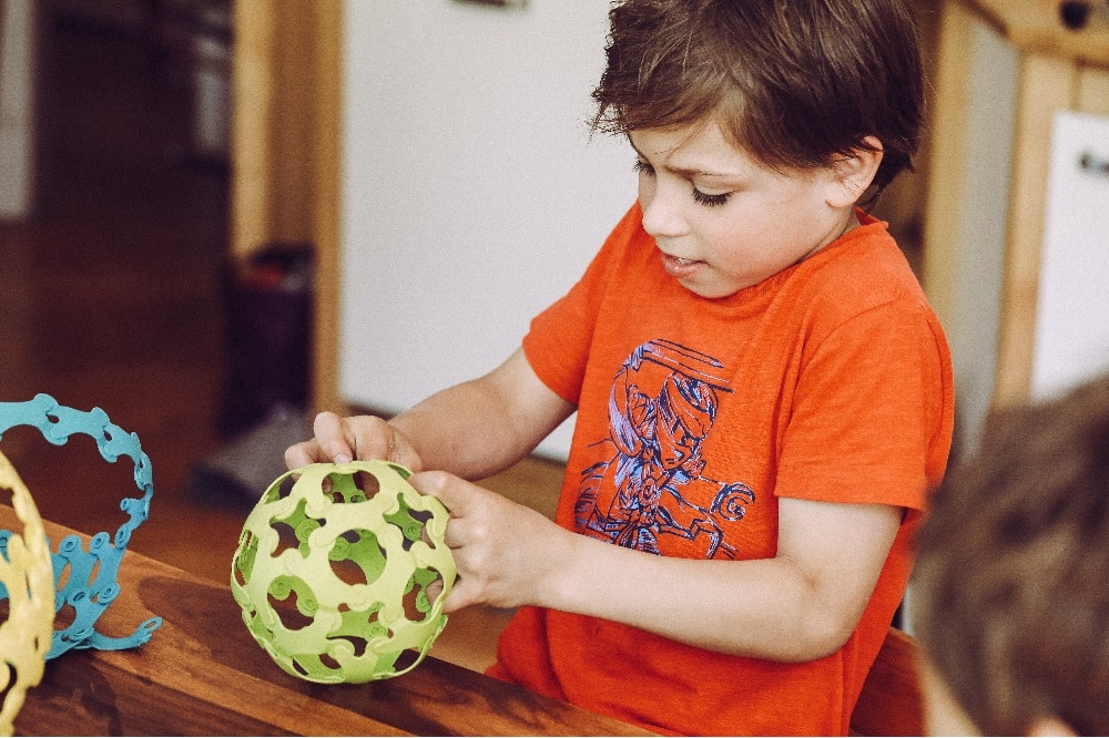 Außerdem ist eine Packung unseres Konstruktionsspiels Binabo beigelegt. Binabo besteht aus vielen bunten, baugleichen Elementen aus Biokunststoff. Verbindet man diese, können einerseits Bewegungsspiele, Bälle, Frisbees, Kegel gebaut werden oder aber Figuren, Tiere et cetera. Der Fantasie sind keine Grenzen gesetzt. Ein kleines Heft mit Anleitungen und Inspirationen liegt bei. Aber eigentlich geht es hier wirklich um das freie Spiel und die eigene Kreativität der Kinder.