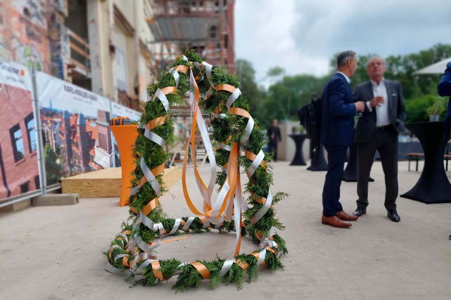 Gleich gegenüber der Ostwache feierte am, Donnerstag, 9. Juni, die GRK Gruppe Richtfest für die historische Karl Krause Fabrik. Noch bis Ende 2023 entstehen in dem früheren Fabrikgebäude aus dem Jahr 1913 131 Eigentumswohnungen mit attraktiven Grundrissen und eine Tiefgarage.