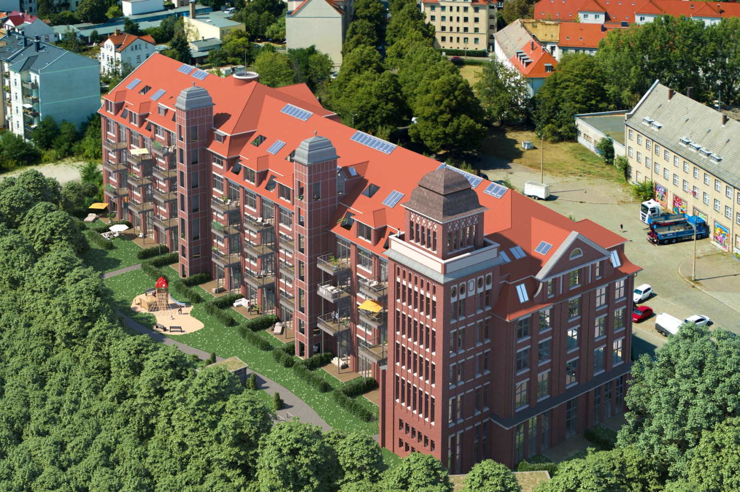 Seit Juli 2021 wandelt das Leipziger Unternehmen, das schon mehrfach mit dem Hieronymus-Lotter-Preis ausgezeichnet wurde, das mächtige Bauwerk auf dem rund 4.440 Quadratmeter großen Grundstück an der Theodor-Neubauer-Straße 60 in eine gehobene Wohnanlage um.