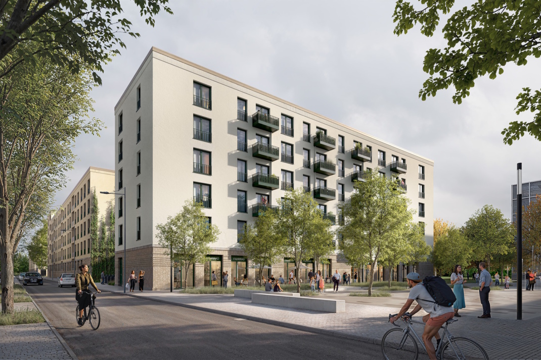 Auf dem größeren Grundstücksteil will Hamburg Team für eine deutsche Pensionskasse ein Wohn- und Gewerbeprojekt mit 130 Mietwohnungen entwickeln, davon 70 geförderte Einheiten, die nach Fertigstellung auch von Hamburg Team gemanagt werden. Ergänzt wird das Gebäudeensemble durch rund 400 m² Gewerbeflächen, eine Tiefgarage mit 62 Stellplätzen sowie gemeinschaftlich nutzbare Freiflächen.