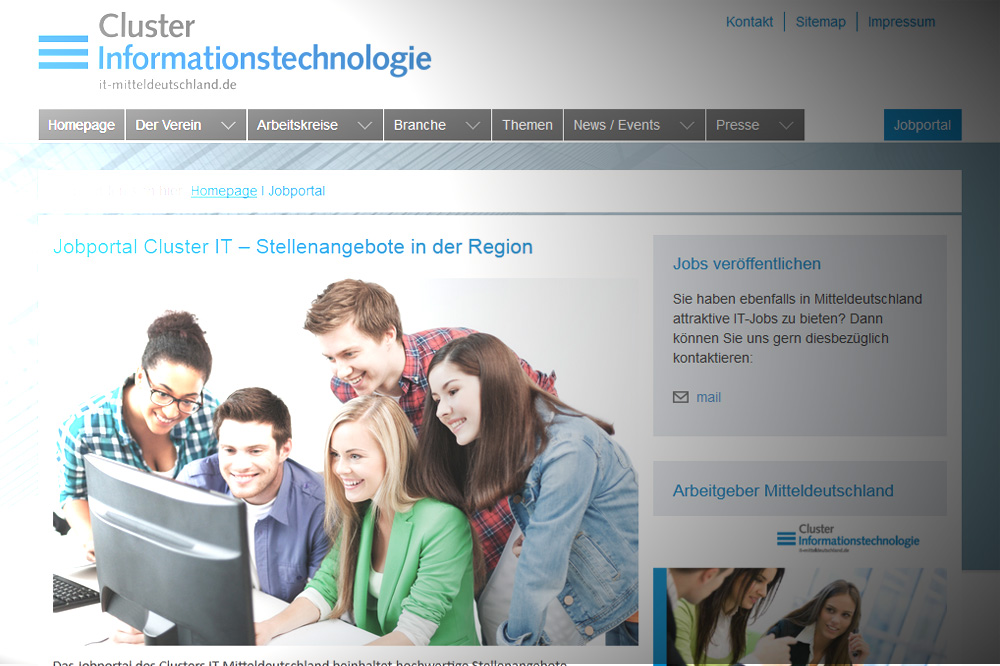 Die Vielfalt der mitteldeutschen IT wird im Jobportal des Clusters deutlich. Es enthält Stellenangebote in den verschiedensten Bereichen der Informationstechnologie – von IT-Dienstleistungen über Hardware und IT-Netzwerken bis zur Softwareentwicklung. Angeboten werden einerseits klassische Berufstätigkeiten sowie andererseits Praktika und Möglichkeiten zum Umsetzen von Abschlussarbeiten. Die Angebote richten sich an Ausbildungsplatzsuchende, Studenten und Absolventen sowie an Fachexperten mit mehrjähriger Berufserfahrung.