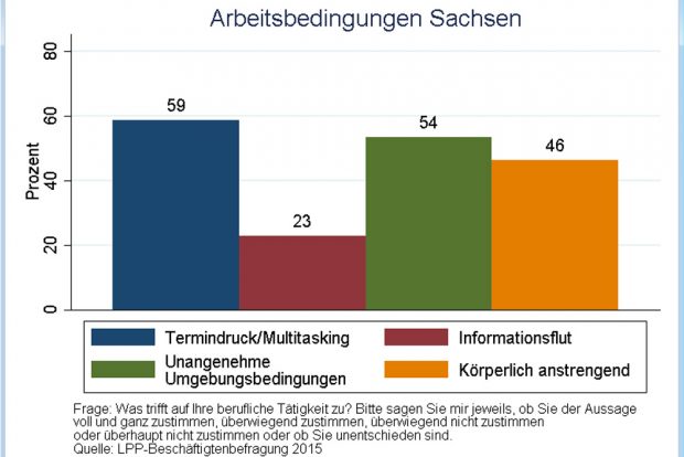 So gaben in Sachsen 59 Prozent der Beschäftigten an, unter Termindruck zu leiden. 23 Prozent leiden unter einer Informationsflut, 54 Prozent unter unangenehmen Umgebungsbedingungen und 46 Prozent unter einer körperlich anstrengenden Tätigkeit.