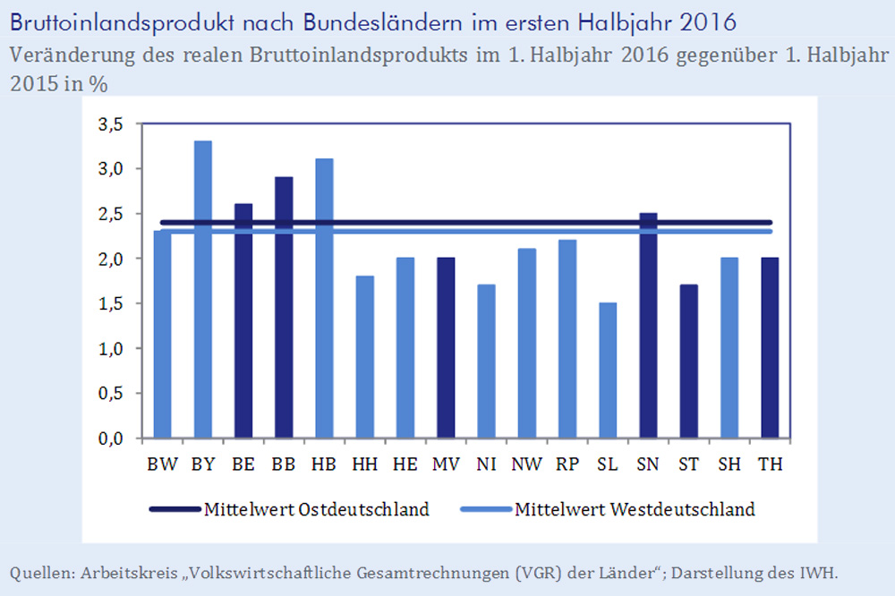 Und was für Sachsen gilt, gilt irgendwie auch für den gesamten Osten, so das IWH: Die ostdeutsche Wirtschaft hat im ersten Halbjahr 2016 etwa so stark zugelegt wie die westdeutsche. Der Zuwachs des Bruttoinlandsprodukts betrug im ersten Halbjahr 2016 gegenüber dem ersten Halbjahr 2015 2,4 %. Dabei ist die Entwicklung durchaus heterogen. Die Zugpferde sind Berlin (2,6 %), Brandenburg (2,9 %) und Sachsen (2,5 %). Den schwächsten ostdeutschen Wert weist Sachsen-Anhalt mit 1,7 % auf.
