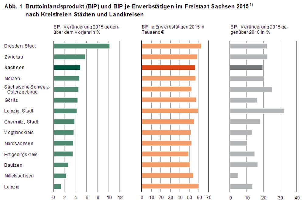 Aber wie gesagt: Das Jahr 2015 war eine (Dresdner) Ausnahme. „Im Vergleich zu 2010 gab es beim BIP je Erwerbstätigen in den Landkreisen Zwickau, Sächsische Schweiz-Osterzgebirge und der Stadt Leipzig die höchste Dynamik, am geringsten fiel das Plus in Mittelsachsen aus.“