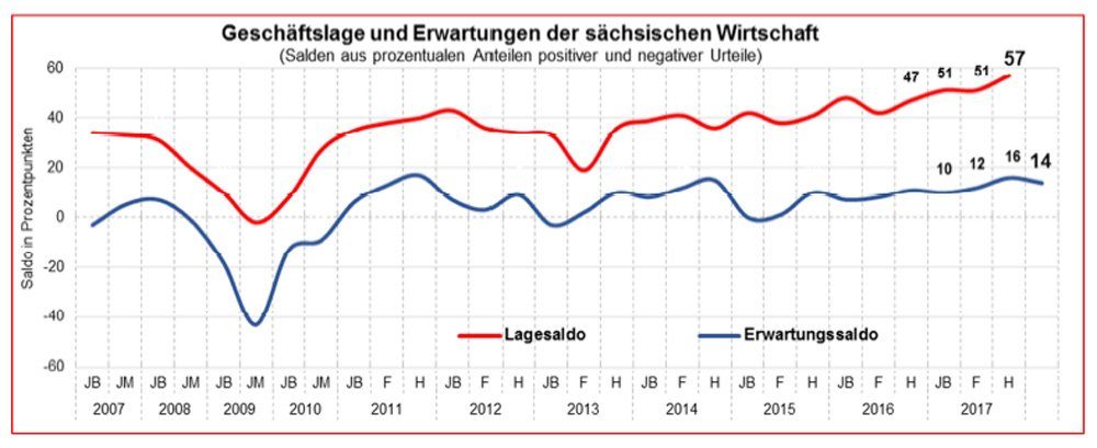 Kristian Kirpal, Präsident der IHK zu Leipzig im Namen der Landesarbeitsgemeinschaft der Industrie- und Handelskammern im Freistaat Sachsen, in der Bewertung: „Die Situation der sächsischen Unternehmen hat sich gegenüber dem Vorjahresstand in allen Wirtschaftsbereichen zum Teil deutlich verbessert und unterstreicht einmal mehr die wirtschaftliche Breite des Aufschwungs. Diese Entwicklung gilt es zu festigen, vor allem mit Blick auf die bevorstehende Regierungsbildung in der Bundespolitik. Wir brauchen Stabilität und Verlässlichkeit. Wichtige Zukunftsfelder müssen weiter intensiv vorangetrieben werden. Dazu zählen unter anderem die Digitalisierung, Investitionen in die Mobilitäts- und Verkehrsinfrastruktur, der Abbau bürokratischer Hemmnisse, die verlässliche und preisgünstige Energieversorgung sowie Strategien für drohende oder bereits bestehende Fachkräfteengpässe.“