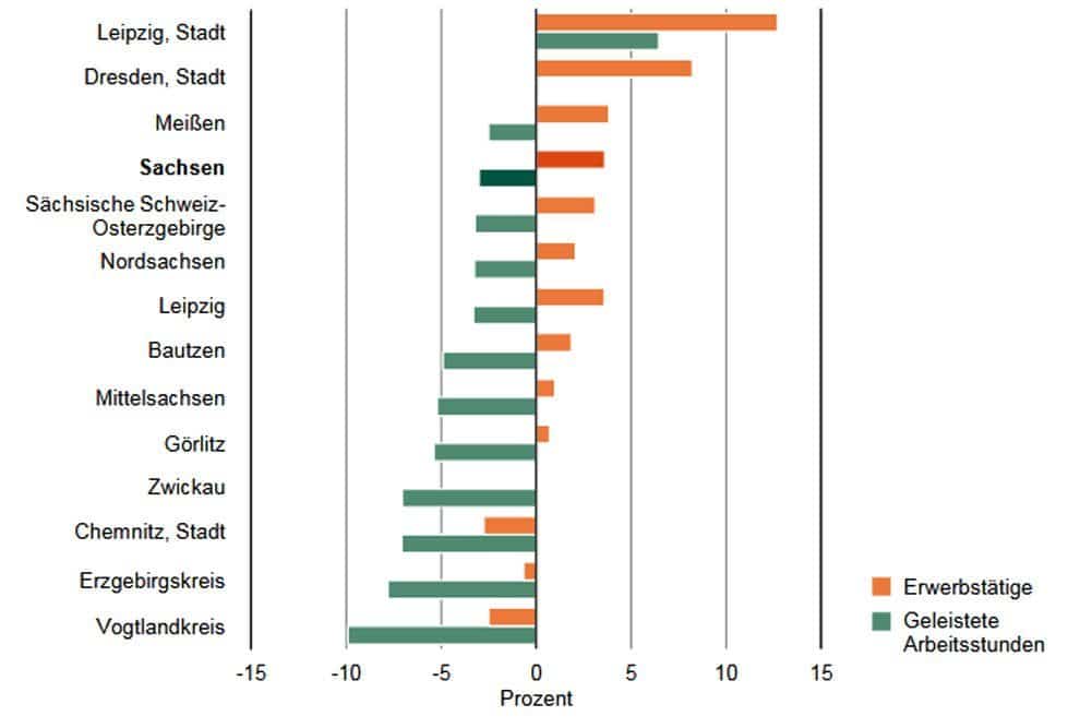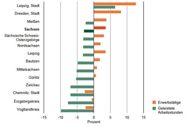 Etwas, was natürlich in Sachsen eine eminente Rolle spielt und scheinbar den Effekt erzeugt, dass die Beschäftigten im Landkreis Meißen mit 1.434 Stunden gleich mehrere Tage länger arbeiteten als die Leipziger und die Chemnitzer mit 1.392 Stunden. In den Großstädten sind Teilzeit und prekäre Beschäftigung deutlich stärker vertreten.
