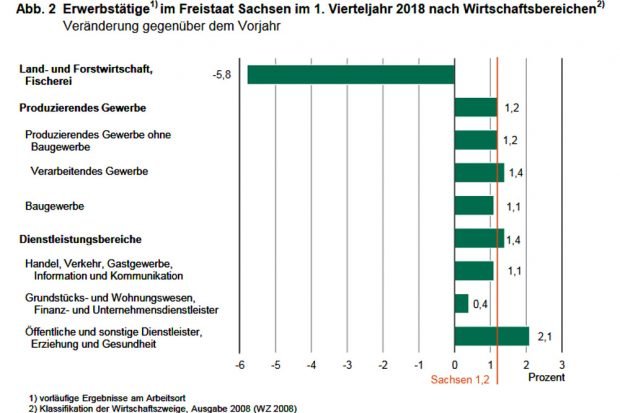 Der Beschäftigungsaufbau in Sachsen geht weiter. Auch im 1. Quartal 2018. „Im ersten Quartal 2018 gab es rund 2.051.600 Erwerbstätige in Sachsen. Im Vergleich zum Vorjahresquartal erhöhte sich deren Anzahl um 1,2 Prozent bzw. rund 25.000 Personen“, meldet das Statistische Landesamt. Es ist vor allem der Dienstleistungsbereich, der die Entwicklung antreibt.