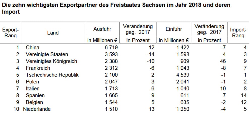 Das Landesamt beschreibt die Handelsergebnisse im Jahr 2018 so: „Sächsische Unternehmen haben im Jahr 2018 Waren im Wert von 40,48 Milliarden Euro ins Ausland exportiert. Damit wurde der Spitzenwert des Jahres 2017 um zwei Prozent verfehlt. Ausschlaggebend dafür war der Rückgang der Lieferungen der wichtigsten Exportprodukte des Freistaates – Personenkraftwagen und Wohnmobile – um 14 Prozent auf 13,26 Milliarden Euro. So ging der Warenwert dieser Erzeugnisse an wichtige Handelspartner wie die Vereinigten Staaten um ein Fünftel, nach Frankreich und Italien um knapp ein Fünftel zurück.“