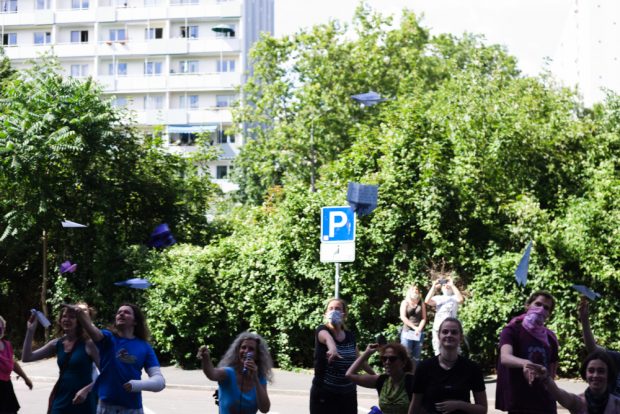 Denn dort im Gebäude der Landesdirektion wird entschieden, ob den Plänen von DHL, der Flughafen Leipzig Halle GmbH und dem Bau der Cargo City Nord stattgegeben wird. Als Aktion hatte das recht neue Bündnis „Für Nächte ohne Fluglärm“ aufgerufen Papierflieger mitzubringen und stellte vor Ort Papier für weitere gefaltete Flieger zur Verfügung.