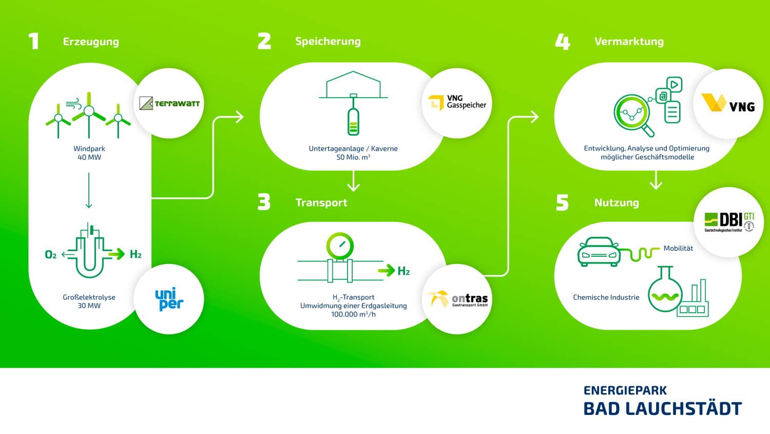Mit dem nun eingegangenen Fördermittelbescheid kann das Projekt jetzt unmittelbar seine Arbeit aufnehmen. Hinter dem „Energiepark Bad Lauchstädt“ steht ein Unternehmenskonsortium aus der Terrawatt Planungsgesellschaft mbH, der Uniper, der VNG Gasspeicher GmbH (VGS), der ONTRAS Gastransport GmbH (ONTRAS), dem DBI – Gastechnologisches Institut gGmbH Freiberg (DBI) sowie der VNG AG.