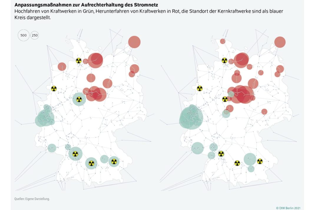 Mit den Worten der Studie: „Die Maßnahmen des Engpassmanagements sind regional unterschiedlich. Im Referenzszenario müssen Kraftwerke im Westen und Süden Deutschlands ihre Erzeugung steigern und im Osten senken, um für einen stabilen Netzbetrieb zu sorgen. Im Szenario ohne Kernkraft muss die Leistung im Westen zusätzlich erhöht und im Osten zusätzlich gesenkt werden.“