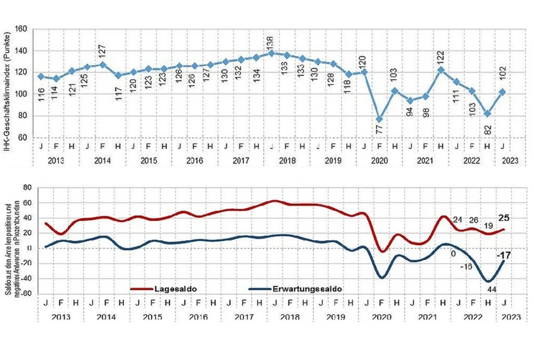 Der IHK-Geschäftsklimaindex klettert nach dem Tiefpunkt im Herbst auf aktuell 102 Punkte, liegt damit aber immer noch 9 Punkte unter dem Wert vom Jahresbeginn 2022, stellt die Arbeitsgemeinschaft der sächsischen IHKs fest.