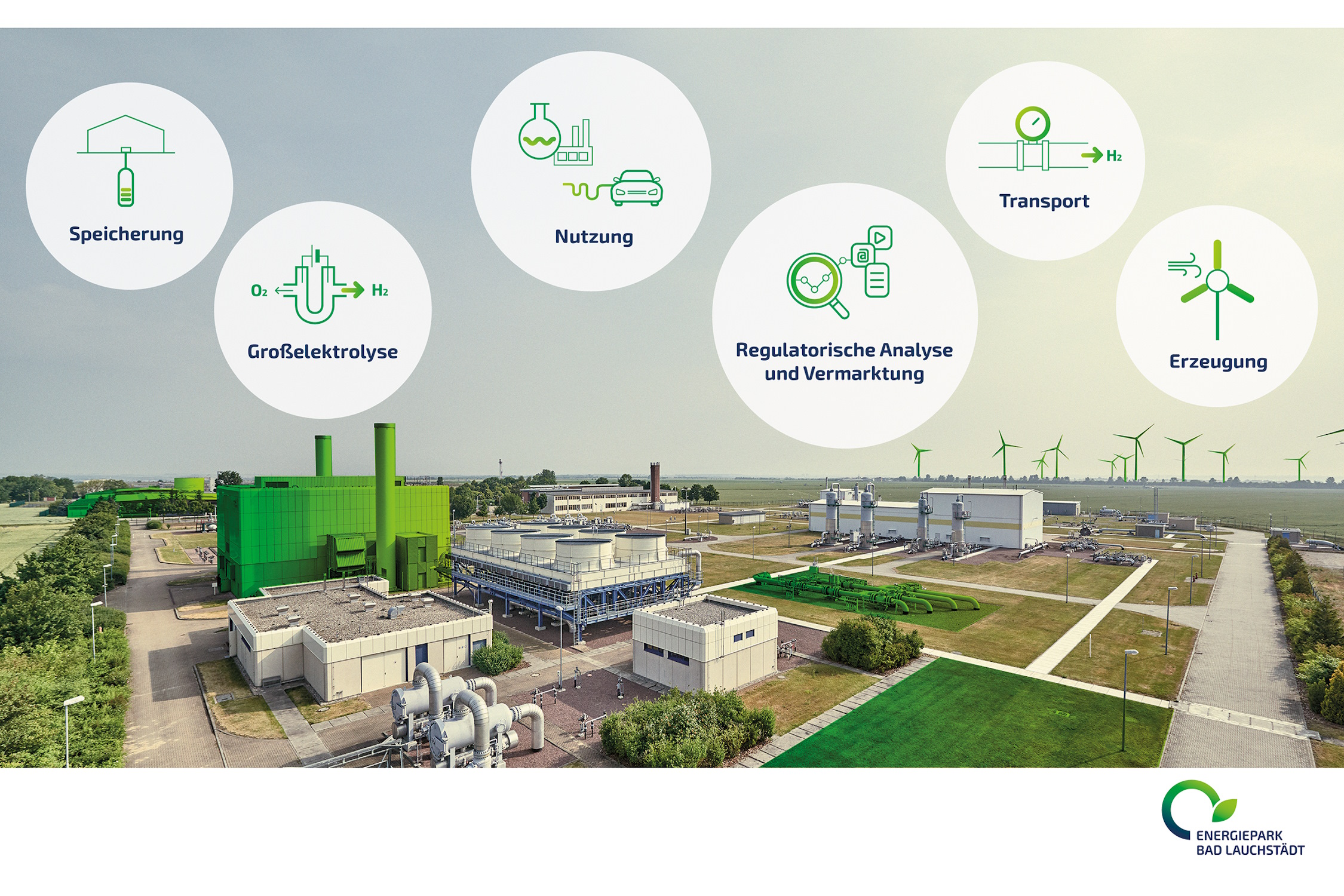 Der Energiepark Bad Lauchstädt ist ein großtechnisch angelegtes Reallabor zur intelligenten Erzeugung von grünem Wasserstoff sowie dessen Speicherung, Transport, Vermarktung und Nutzung. Als Reallabor der Energiewende wird dabei erstmalig die gesamte Wertschöpfungskette von grünem Wasserstoff im industriellen Maßstab erprobt.