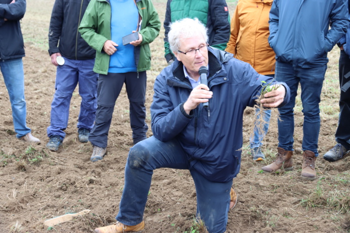 Und anders bewirtschaften heißt eben auch oft, mit anderem Gerät arbeiten, sodass am Feldtag auch Maschinen wie Flachgrubber, Tiefenlockerer, Fräse usw. vorgeführt werden konnten. Wobei natürlich trotzdem das Thema Bodenverdichtung im Raum stand: Wie kann man die Böden schonen, indem man weniger schwere Technik einsetzt? Oder gar andere Anbaumethoden anwendet?