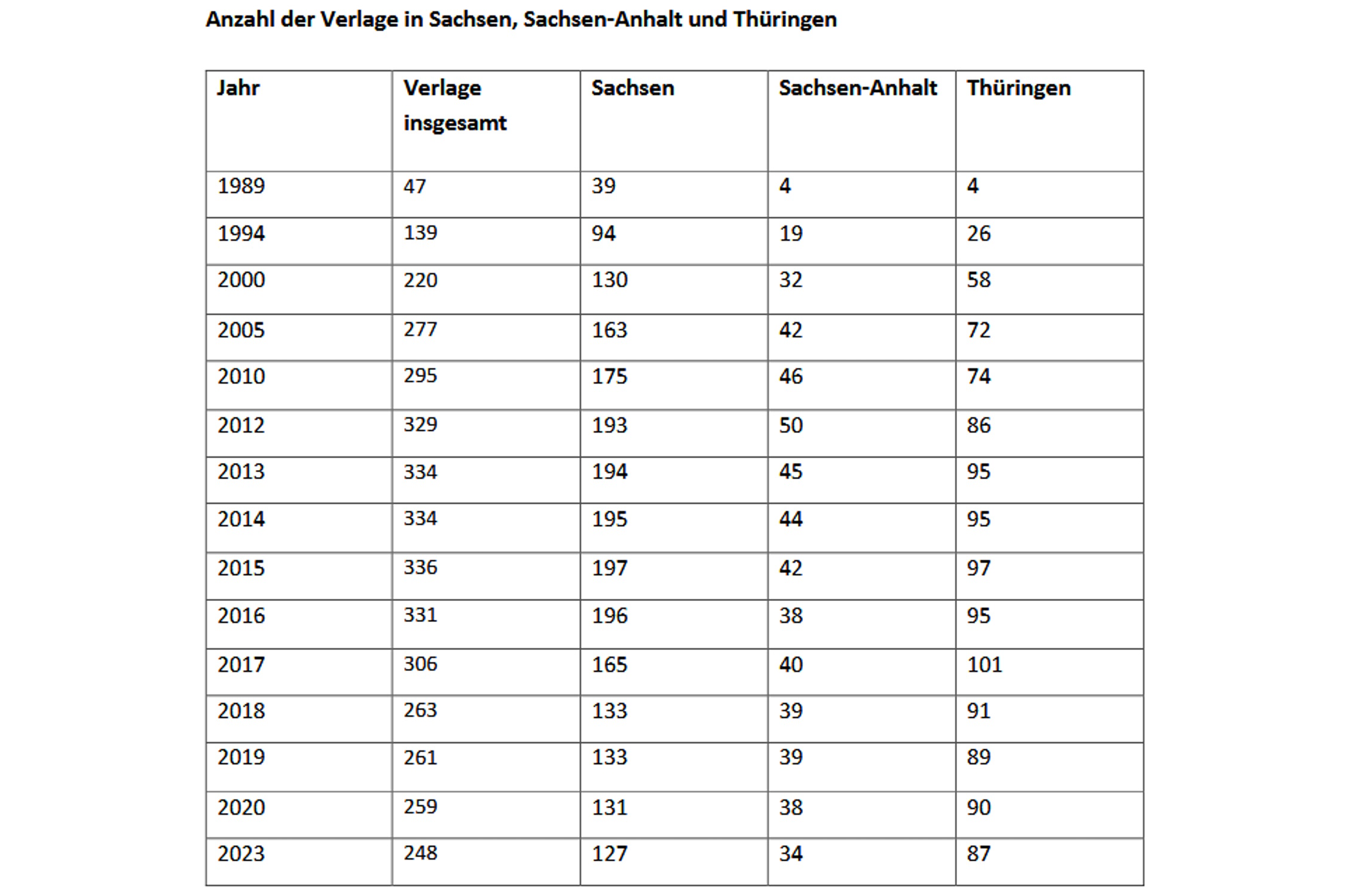 2023 zählte der Börsenverein nur noch 248 Verlage in den drei Bundesländern, davon 127 in Sachsen, 34 in Sachsen-Anhalt und 87 in Thüringen.