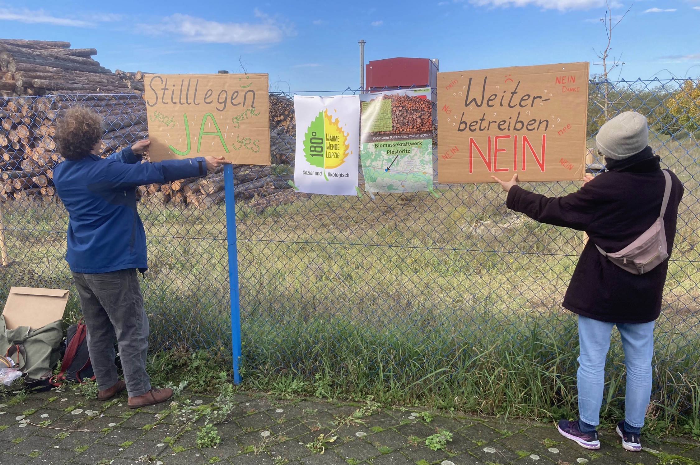 Anlässlich des Internationalen Aktionstages gegen das Verfeuern von Holz protestierten am Dienstag, dem 21. Oktober, Aktive von der Kampagne „180° Wärmewende Leipzig“ vor dem Holzkraftwerk in Piesteritz gegen einen möglichen Weiterbetrieb durch die Stadtwerke Lutherstadt Wittenberg. Nach der Aktion unter dem Motto „Stilllegen JA, Weiterbetreiben NEIN“ wurde zudem dem Bürgermeister von Wittenberg und Aufsichtsratsvorsitzenden der dortigen Stadtwerke, Torsten Zugehör, ein offener Brief von den Umweltgruppen „180° Wärmewende Leipzig“ sowie NABU, ROBIN WOOD und Biofuelwatch überbracht.