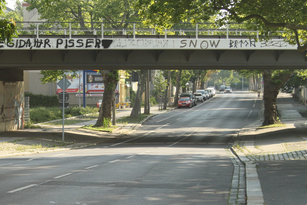 Und der Weg durch den Park von der Theresienstraße zur Erlenstraße/Blochmannstraße scheitert nicht nur am Übergang über die Gleise. Es gibt auch keinen direkten Weg durch den Park in Richtung Erlenstraße. Dort, wo der Übergang im Park wäre, stehen heute große Bäume und hat sich auch eine kleine Hecke entwickelt. Der Weg durch den Park mündet kurz vor der Brücke auf den Gehweg/Radweg, was zur Erreichung der Erlenstraße deutlich zu umwegig wäre. Angesichts dessen, dass dafür ein größerer Umbau der Wege im Park und der Fahrbahnen auf der Delitzscher Straße notwendig wäre (die Flächen für den Z-Übergang sind ohne Umbau nicht vorhanden) stehen die Chancen auf eine Realisierung in den nächsten 20 Jahren sehr schlecht.