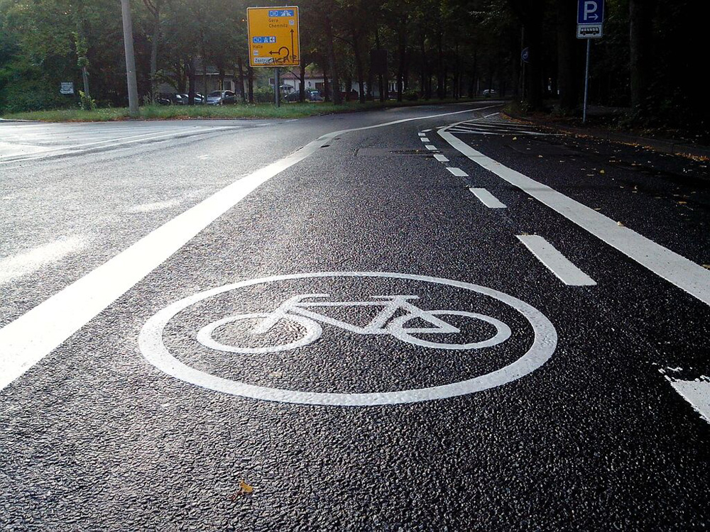 Frisch markiert: Die Busparkplätze für die Gäste des Stadions und die Radfahrstreifen - nun in Standardbreite. Zum Abzweig Kläranlage/DHfK ist nur noch eine Fahrspur zu überqueren. Foto: Alexander John / ADFC Leipzig