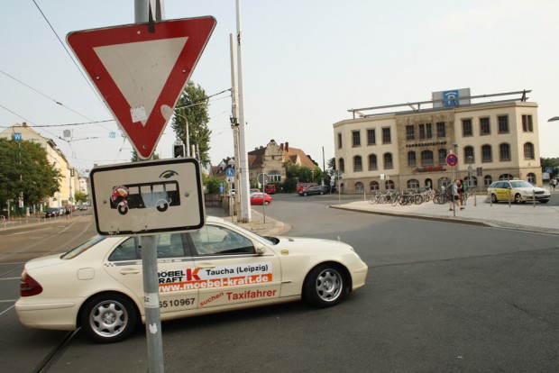 Und da der Fußweg, auf den die Radfahrer eigentlich sollen, für den Normalbetrieb zu schmal ist, fahren viele Radfahrer dann doch lieber zwischen den Gleisen der LVB Richtung Berliner Straße. Eine kürzliche Anfrage an die LVB hat ja ergeben, dass man dort auf Jahre hinaus nicht an einen Umbau der Kurt-Schumacher-Straße denkt. Das kleine Schildchen unterm Fußgängerschild zeigt eigentlich deutlich genug, dass hier die Verkehrsplaner reineweg nur Bahnhof gedacht haben, Radfahrer aber irgendwie gar nicht erwartet haben. Wer will denn schon vom Hauptbahnhof in den Nordwesten? Das können doch nur Verrückte sein.