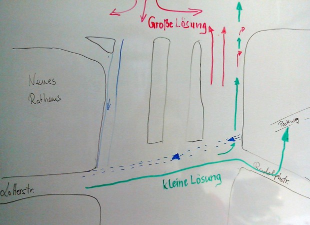 Im Zuge der Diskussion um die Radverkehrsführung im Straßenzug Harkortstraße – Floßplatz – Dufourstraße hatte der ADFC auch angeregt, den Radverkehr bereits ab der Haltestelle Neues Rathaus auf der Fahrbahn bzw. auf Radfahrstreifen oder in einer Kombispur (rechtsabbiegender Kfz-Verkehr und Radverkehr in einer Fahrspur) zu führen. Auch damit könnte man die Situation für den Rad- und Fußverkehr an der Stelle entspannen.
