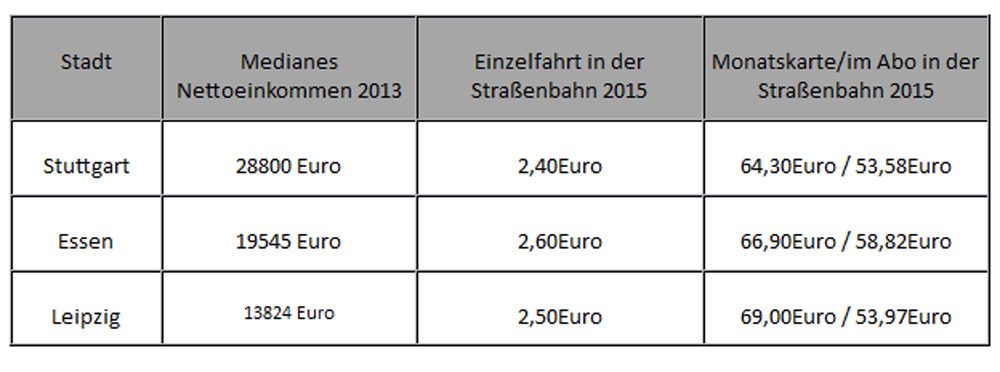 Und Volker Holzendorf, Sprecher der AG Stadtentwicklung und Mobilität der Leipziger Grünen, rechnet vor: „Die aktuell angekündigten Preiserhöhungen sind auch deswegen unverständlich, weil Leipzig eine viel geringere Kaufkraft als vergleichbar große Städte hat. Während in Stuttgart nur 3 Prozent des durchschnittlichen Tagesverdienstes für eine Einzelfahrt ausgegeben werden müssen und es in Essen knapp 5 Prozent sind, ist es in Leipzig mit über 6,5 Prozent fast schon Wucher.“