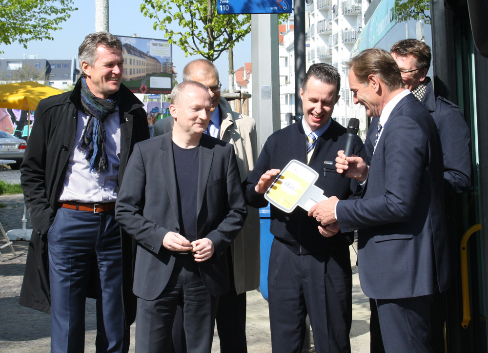 Am Samstag, 30. April, haben die LVB gleich einen ganzen Schwung Fahrer auf dem E-Bus qualifiziert. Thomas Richter war dann am Montag der erste Fahrer, der in den Linienbetrieb durfte und auch den symbolischen Schlüssel überreicht bekam. Bei der ersten Spritztour mit den Journalisten hat er auch gleich OBM Burkhard Jung zur Arbeit ins Rathaus gefahren.