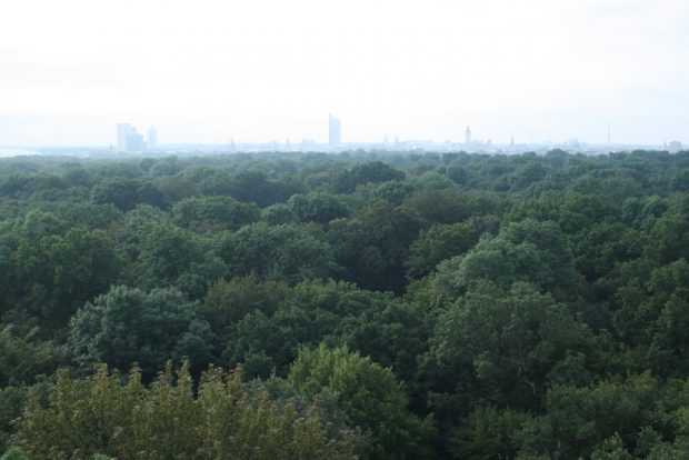 Ist wenigstens die „Dunstige“ zu sehen von hier oben? Ist sie nicht. Sie ist unterm Blätterdach verschwunden. Ein Meer von Bäumen breitet sich ostwärts aus. Das ist das Rosental, über dessen Namen in Leipziger Moritaten genauso wild gemunkelt wird wie über den Namen der Parthe. Hier wachsen doch gar keine Rosen!?