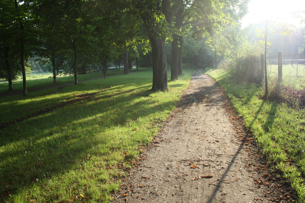 Ein Obacht-Schild wäre gut, denn was auf der Karte Reiterallee heißt, sind nur zwei Reihen alter Bäume mit zwei (Reit-)Pfaden rechts und links und grünem Gras in der Mitte. Genau da müssen wir lang.
