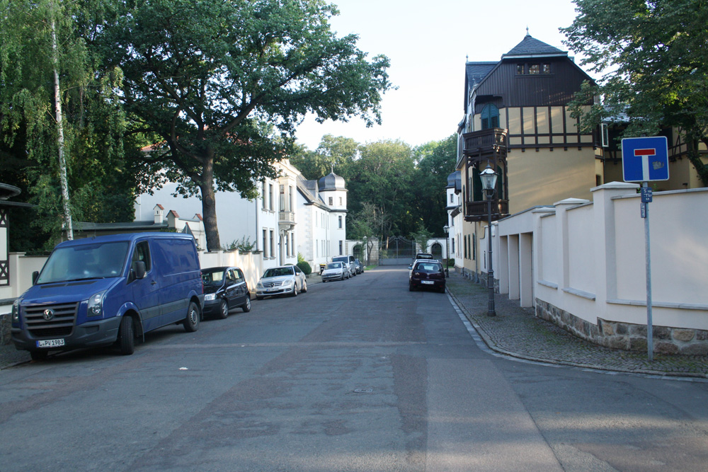Tatsächlich könnten wir an dieser Weggabel nach rechts abbiegen und würden nicht nur auf den verschwiegenen Abtnaundorfer Parkteich mit seinem kleinen Pavillon stoßen, sondern noch ein Stück weiter auch einen Blick auf die Einfahrt zum Abtnaundorfer Schloss werfen.