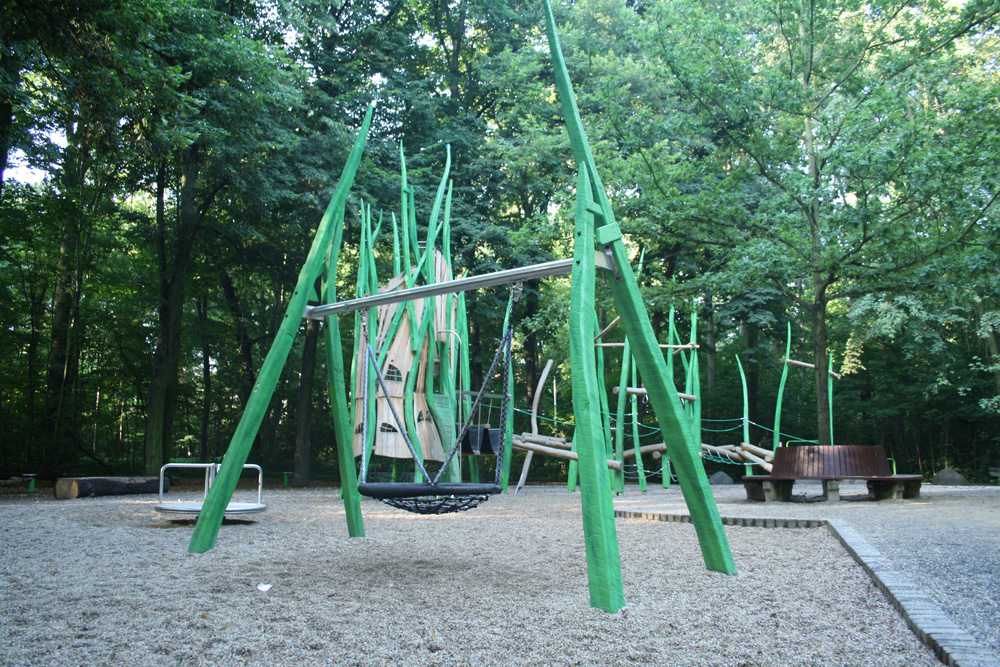 „Entstanden ist unter Einbezug der Bürger eine ‚Gräserlandschaft‘ aus Hölzern mit vielfältigen Bewegungsmöglichkeiten. Teile der Spielfigur ‚Hebekopfdrachen‘ wurden wiederverwendet. In der vergrößerten Sandspielfläche steht ein Sandspielhaus zum Verstecken und Klettern“, beschreibt die Stadt das Entstandene. „Der Seil- und Klettergarten unter dem Motto ‚Gräserland‘ bietet Balancierhölzer, Seile, Netze, eine Hangelstrecke, einen Wellengurtsteg und einen Gräserturm mit einer Podesthöhe von zwei Metern. Von den Bürgern waren mehrheitlich mit Schaukel und Karussell auch zwei klassische Spielgeräte gewünscht, die nun realisiert wurden. An einer Slackline, einem Dreifachreck und dem Wackelbalken können Geschicklichkeitsübungen durchgeführt werden. Zudem wurde der beliebte und insbesondere auch schon von der Elterngeneration bespielte Betonelefant sinnvoll verändert.“
