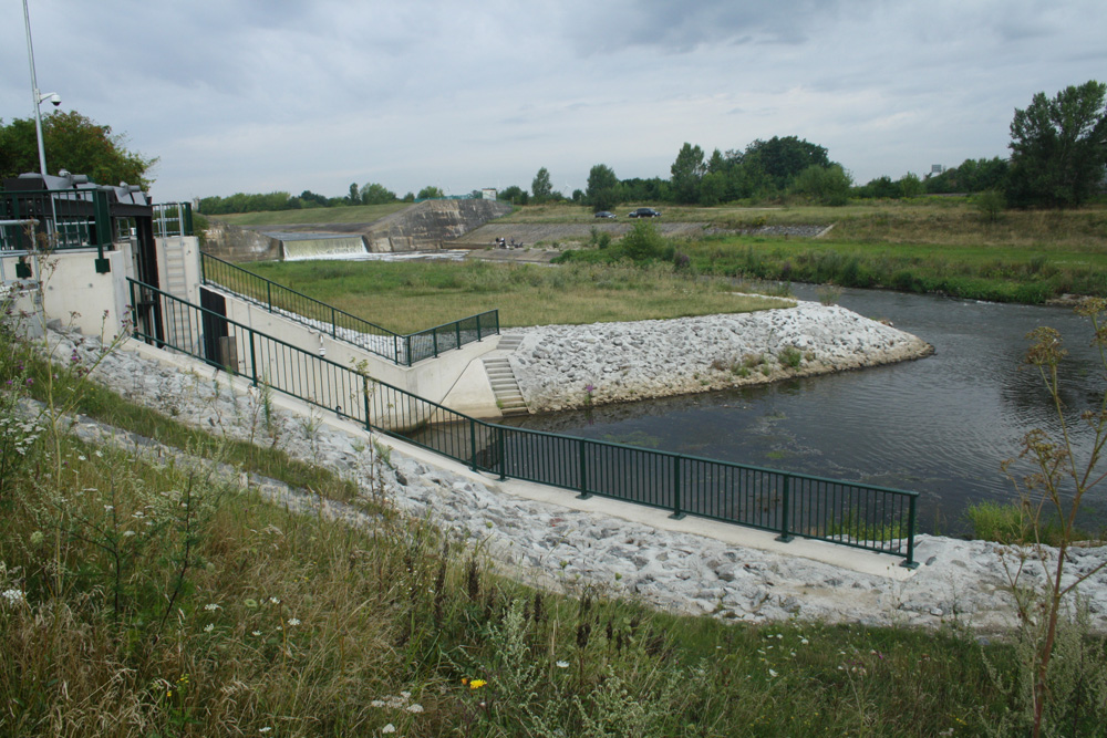 Das Einlassbauwerk war ja bekanntlich 2013 knapp vor dem Hochwasser erst fertig geworden. Glück für Leipzig. Der See hat als Retter funktioniert. Dieses Einlassbauwerk befindet sich noch 5 Kilometer weiter südlich. Da fahren wir heute nicht mehr hin, werfen aber einen zumindest staunenden Blick auf die Weiße Elster, die hier in einer gewaltigen Betonrinne ankommt. Denn selbst diesen Fluss haben die Bergleute verlegt, um an die Kohle zu kommen. Und damit ihnen der Tagebau garantiert nicht absäuft, haben sie die Elster auf mehreren Kilometern in ein Betonbett gepackt. Das ist die Betonelster. Hier hat man also gleich drei gigantische Ingenieurbauwerke an einem Platz.