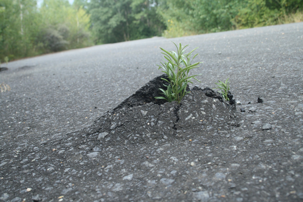 Auf dem Rückweg entdecken wir dann im alten Asphalt die Botschaft, die uns zumindest tröstet, dass sich das Leben nicht unterkriegen lässt, auch wenn es die Menschheit vergeigen sollte. Und es sieht ganz so aus, als werde es die Menschheit jetzt so richtig vergeigen. Aus dem Asphalt kämpft sich der Trieb einer Pflanze. Nicht mal ein Baum, eher so ein tapferes Ödlandgewächs, das hier aber zeigt, was für eine Kraft in so einem grünen Spross steckt. Diese Pflanzen werden auch nach uns da sein und ans Licht drängen. Und vielleicht gibt’s in fünf Millionen Jahren auch eine neue Spezies, die unsere Hinterlassenschaften findet und sich fragt, wie wir es geschafft haben, die Sache so gründlich zu vermasseln.