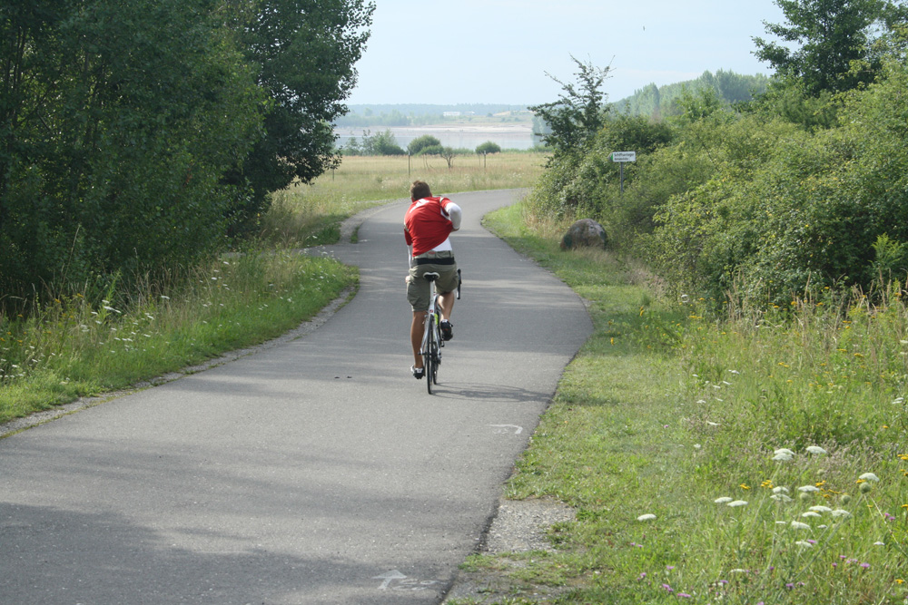 Ab hier zeigt die Strecke, was neu entsteht, wenn eine alte Kohlelandschaft neu gestaltet wird. Das ist ganz sicher ein Problem für das Neuseenland. Denn mit der Devastierung der einstigen Dörfer und Flecken, Vorwerke und ländlichen Strukturen ist auch die Kleinteiligkeit verloren gegangen. Die neuen Strukturen, die oft sogar direkt auf einstigen kilometerlangen Bergbaustraßen beruhen, sind etwas für Leute, die gern Kilometer schrubben und in hohen Gängen strampeln. Eine gewisse Eintönigkeit ist diesen Streckenabschnitten nicht abzusprechen.