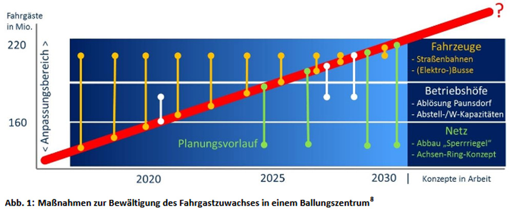 Im Bericht wird es direkt am Beispiel LVB durchexerziert. Aber man sieht sofort, dass man – ganz ähnlich wie in einigen der Leipziger Mobilitätsszenarien – von erstaunlich niedrigen Zielzahlen ausgeht. In diesem Fall von 220 Millionen Fahrgästen im Jahr 2030 (2017 werden es etwas über 150 Millionen). Bis 2024, so kann man lesen, geht man sogar davon aus, dass der Zuwachs im bestehenden System geleistet werden kann. Und erst dann glaubt man, in die Planungen für die Erweiterung des Netzes einsteigen zu müssen. Wer die heutigen Engpässe im Netz kennt, weiß, dass Leipzig so viel Zeit gar nicht hat. Dass die zusätzlichen 65 Millionen Euro nicht erst ab 2024 nötig werden, sondern eigentlich schon ab 2019, mit dem neuen Doppelhaushalt.