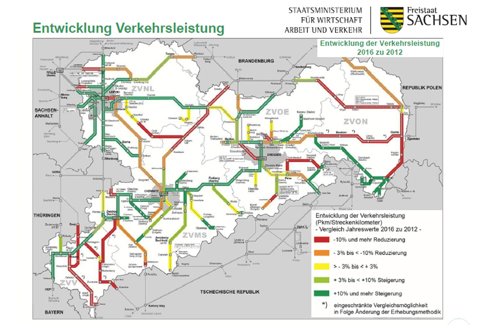 In der beigefügten Karte hätten sie mit einem Plus von 20 Prozent sogar noch viel dunkler dargestellt werden müssen. Gerade das Netz um Leipzig zeigt, welches Potenzial im SPNV steckt – und wie gern auch Pendler auf den Zug umsteigen, wenn er oft und schnell und regelmäßig verkehrt.