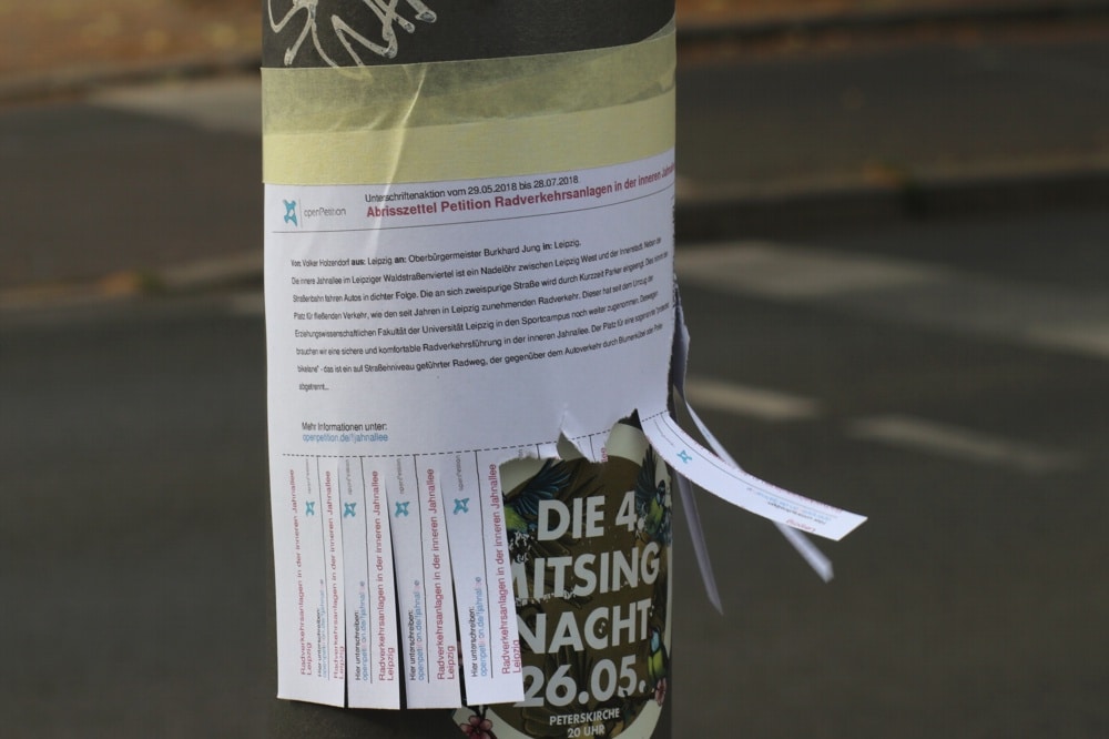„Radfahrer*innen in Leipzig haben ihre Stimme erhoben und sind nicht mehr anonym“, freut sich Volker Holzendorf, Initiator der Petition „Sicheren Radverkehr in der Inneren Jahnallee in Leipzig ermöglichen“. „In nicht einmal einem Monat haben über 3.300 Menschen aus Leipzig unterschrieben, um auf den Missstand hinzuweisen, dem der Radverkehr in der Inneren Jahnallee seit 2006 ausgesetzt ist!“