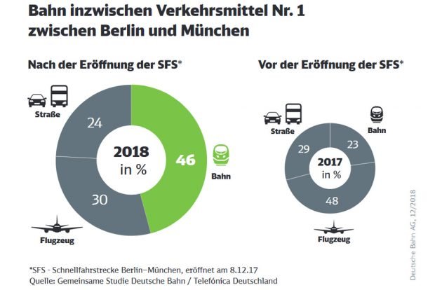 Dies ergibt eine gemeinsame Studie der Deutschen Bahn (DB) und Telefónica Deutschland. Demnach nutzen 46 Prozent aller Reisenden die Bahn, 30 Prozent das Flugzeug und 24 Prozent das Auto oder den Bus. Vor dem Start der Strecke lag der Anteil der Bahn noch bei 23 Prozent. Das Flugzeug lag mit 48 Prozent an der Spitze. Insgesamt zählte die DB bislang 4,4 Millionen Reisende zwischen Berlin und München und damit doppelt so viele wie im Vorjahr.