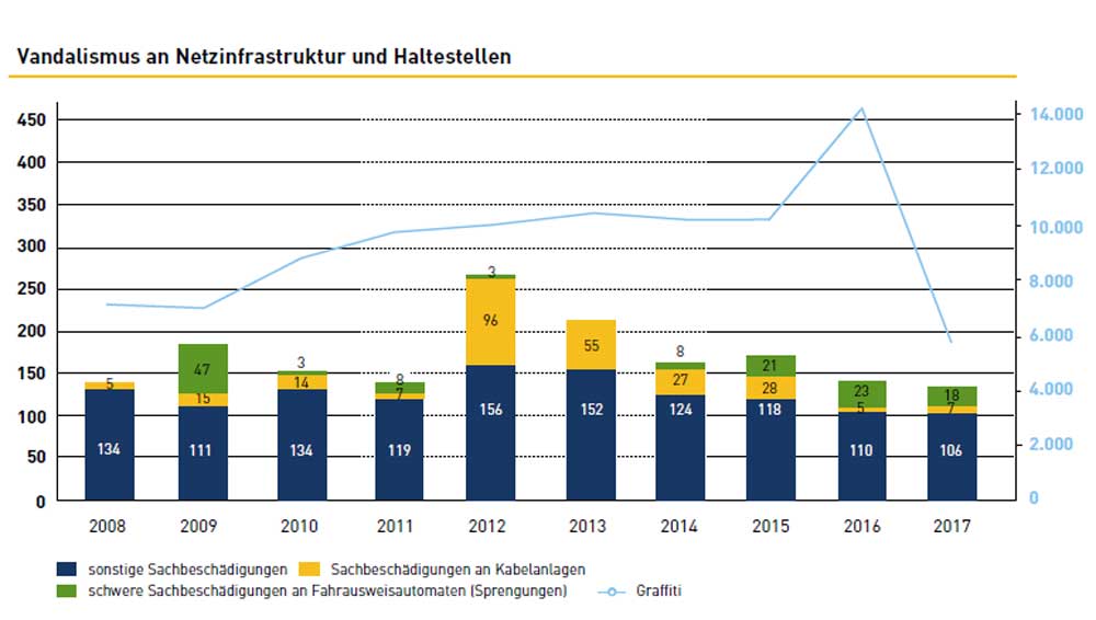 Wobei sich mehrere Felder von Aggression abzeichnen. So schwanken zu Beispiel die mutwilligen Beschädigungen an Bussen und Straßenbahnen seit Jahren, bleiben aber auf recht hohem Niveau. Sachbeschädigungen an den Infrastrukturanlagen (Wartehäuschen, Kabelanlagen, Automaten) gehen zwar seit 2012 spürbar zurück. Dafür haben im Detail die Zerstörungen von Fahrkartenautomaten seit 2015 zugenommen.