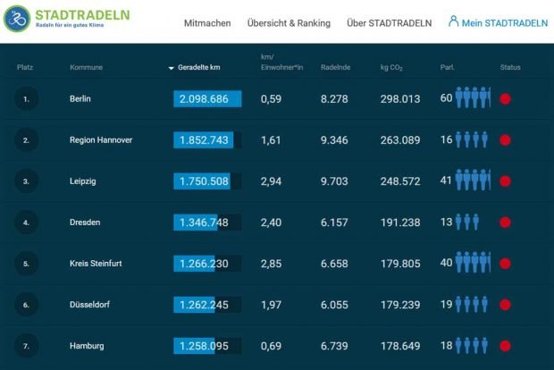 Wenn natürlich Städte wie Berlin mitmachen, geht der Wettbewerb im Stadtradeln in Deutschland erst richtig los. Und zwar gerade weil in Berlin das Thema eines besseren Radverkehrs seit Jahren auf der politischen Agenda steht und dort mit deutlich härteren Bandagen ausgekämpft wird als zum Beispiel in Leipzig. Leipzig hat zwar in der Vergangenheit schon mal das Stadtradeln gewinnen können. Aber mit Berlin geht es jetzt in völlig andere Dimensionen.