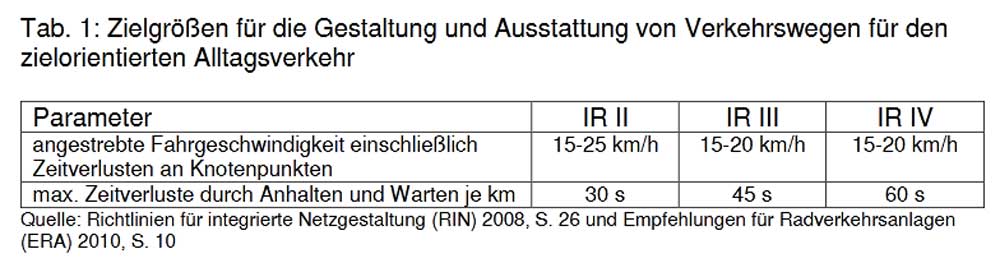 Wobei die Unterschiede eher keinen großen Unterschied machen. Jedenfalls nicht, was die Bedingungen für die Radfahrenden betrifft, denn als Richtgeschwindigkeit werden Zielgrößen von 15 bis 20 Kilometern pro Stunde angegeben, auf IR II sogar 25. Das ist schnell. Das weiß jeder, der täglich unterwegs ist.