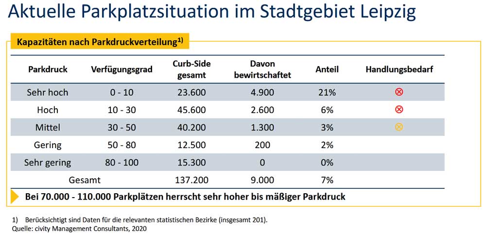 Leipzig besitzt – nach der Vorlage der Leipziger Verkehrsbetriebe (LVB), die die Stadt mit dem Projekt beauftragen möchte, 137.200 Stellplätze am Straßenrand, in der abgebildeten Tabelle als „Curb-Side“ bezeichnet, was auf Deutsch nichts anderes heißt als „Straßenrand“. Wer rechnen mag, darf rechnen: Zum Jahreswechsel waren in Leipzig allein 202.327 Privat-Pkw registriert. Mit diversen Betriebs-Pkw und allerlei Klein- und Großtransporten werden es über 263.000 Fahrzeuge.