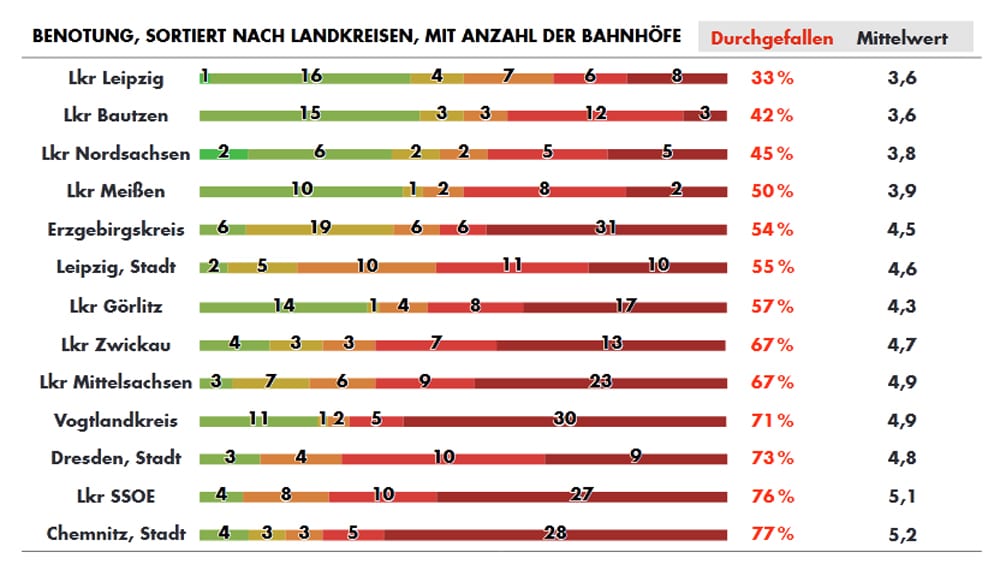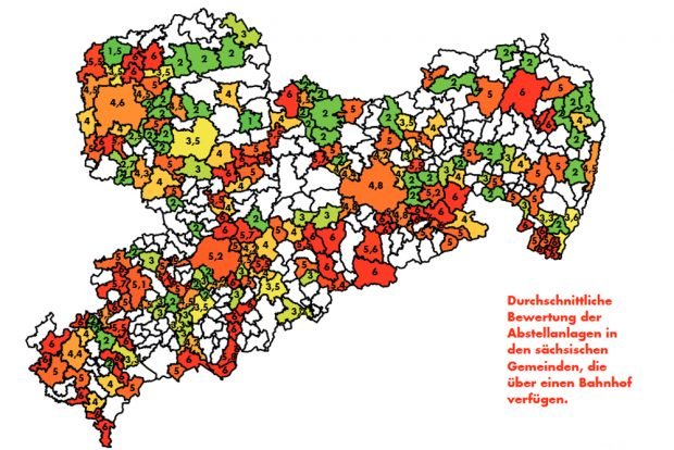Zwischen den sächsischen Landkreisen existieren teils erhebliche Unterschiede. Während im Landkreis Sächsische Schweiz-Osterzgebirge die Abstellanlagen im Mittel nur Note 5,1 erreichten, erhielten die Landkreise Leipzig und Bautzen durchschnittlich die Schulnote 3,6. Hier verfügen 42 % der Bahnhöfe über eine gute Ausstattung. Die sächsischen Großstädte schnitten in der Studie insgesamt nicht gut ab. In Leipzig verfügen 55 % der Stationen über keine oder mangelhafte Abstellanlagen. In Dresden sind es 73 % und in Chemnitz sogar 77 %.