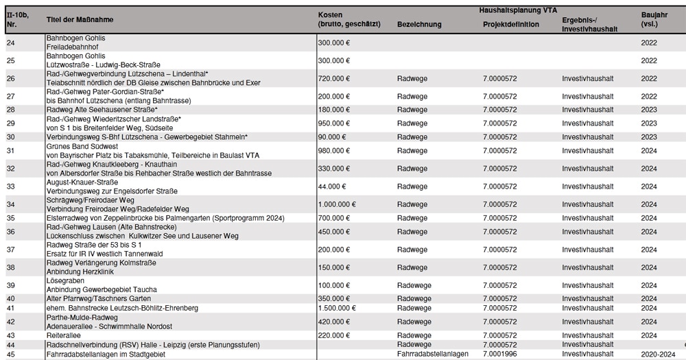 Geht es beim Radverkehr wenigstens ein bisschen schneller? Der Lichtblick ist zumindest: Die Stadt will bis 2024 tatsächlich einmal mehr Geld für Radverkehr ausgeben als in den kärglichen Vorjahren. Von den 357 Millionen Euro, die Stadt und LVB bis 2024 in ihre gemeinsamen Straßenbauprojekte investieren wollen (LVB 147 Millionen, Stadt 210 Millionen Euro) sollen 17 Millionen in Radverkehrsanlagen fließen (und 12,5 Millionen Euro in Anlagen für Fußgänger).
