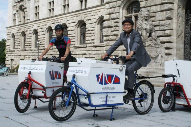Nicht die gesamte. Das hatte das Hauptamt in seiner Stellungnahme auch erklärt. Denn nicht alle Fuhren sind für Ämter und Einrichtungen im Stadtgebiet bestimmt. Manche gehen auch über die Stadtgrenzen hinweg – bis nach Borna, so Dr. Christian Aegerter, der zuständige Hauptamtsleiter, der am Montag, 3. August, den neuen Kurierdienst für die beiden innerstädtischen Touren vorstellte – die Fulmo Kurierdienst GbR, die mit zwei Rädern mit großem Anhänger vorrollte, zusätzlich elektrisch betrieben.