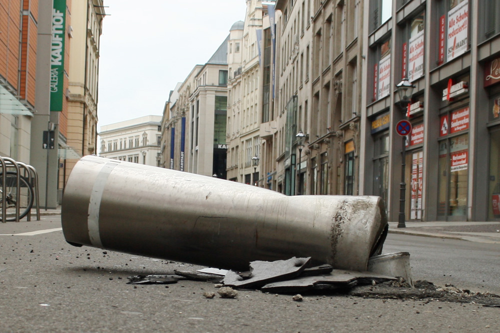 Wir können ja das Bild vom brutal umgefahrenen Poller vom Neumarkt hier wieder einblenden – was wir auch machen. Denn in der Regel räumt Leipzig die mit Auto-PS umgewalzten Poller meist relativ schnell wieder weg, sodass die meisten Leipziger gar nicht merken, mit welcher Rücksichtslosigkeit einige Autobesitzer alles niederfahren, was sie in ihrem Besitzanspruch eingrenzt. So geht es auch den eher niedlichen Pollern in der Richard-Lehmann-Straße.