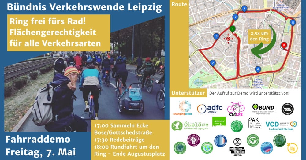 Ab 17 Uhr startet die Kundgebung an der Kreuzung Bose-/Gottschedstraße, anschließend wird eine Fahrraddemonstration um den Innenstadtring stattfinden. Der Aufruf wird von 18 Initiativen unterstützt. Darunter befinden sich alle relevanten Leipziger Mobilitäts-, Umwelt- und Klimaschutzorganisationen und -gruppierungen der Stadt Leipzig.